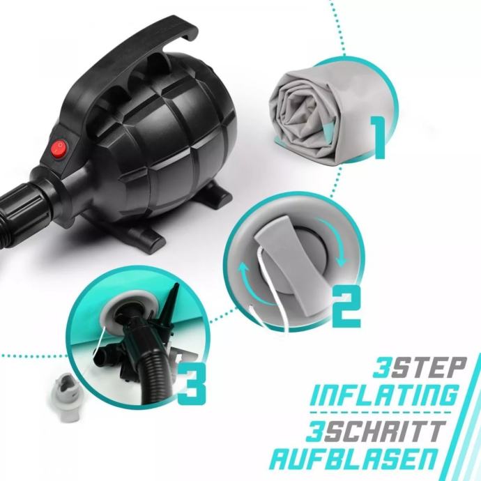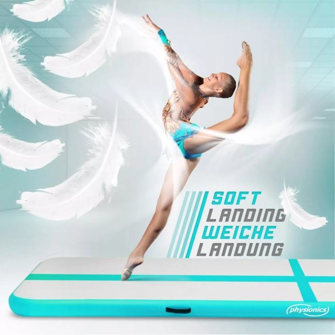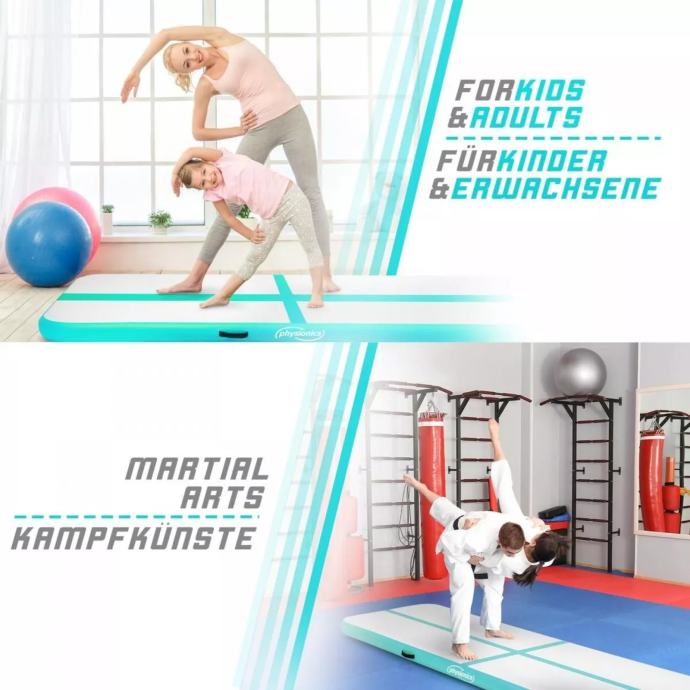 Gimnastička prostirka na napuhavanje je svestrana sprava za vježbanje prikladna za razne sportske aktivnosti, kao što su: Npr., gimnastika, cheerleading, parkour, borilačke vještine, školski sportovi, trampolin parkovi, akrobacije, itd. Naša gimnastička prostirka debela je 10 cm i izrađena je od PVC cerade, materijala s dvostrukim stijenkama čija je najvažnija značajka održavanje oblika i stabilnosti konstrukcije pod vanjskim pritiskom i zadržati udar. Ova je staza opremljena električnom zračnom pumpom i kompletom za popravak.