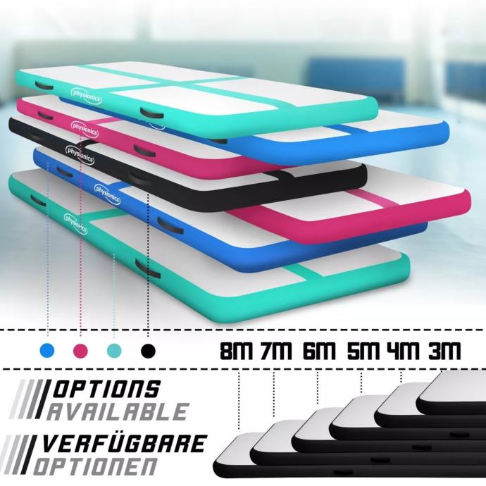 Gimnastička prostirka na napuhavanje dostupna je u sljedećim dimenzijama (D/Š/V):