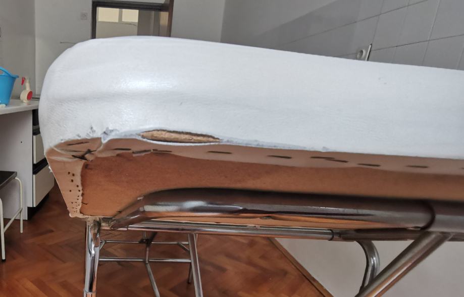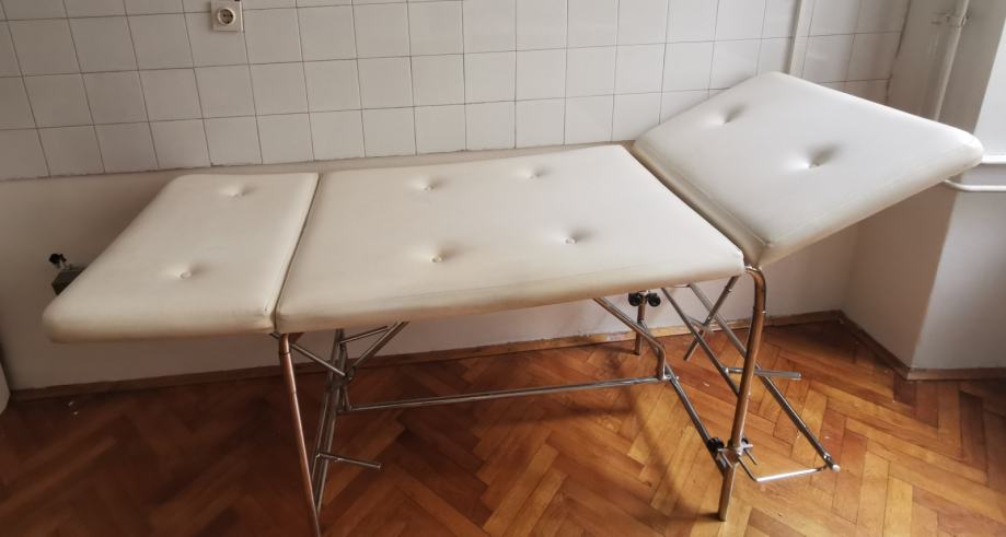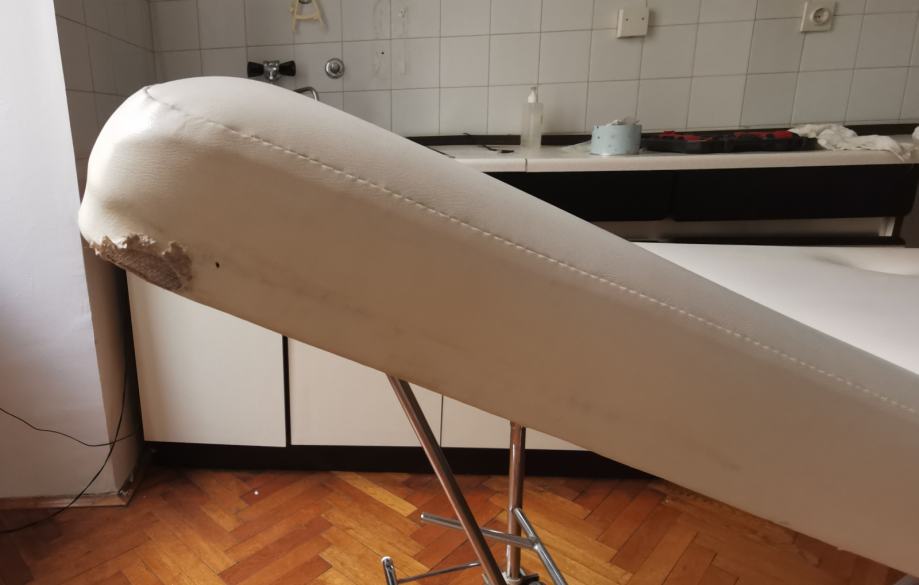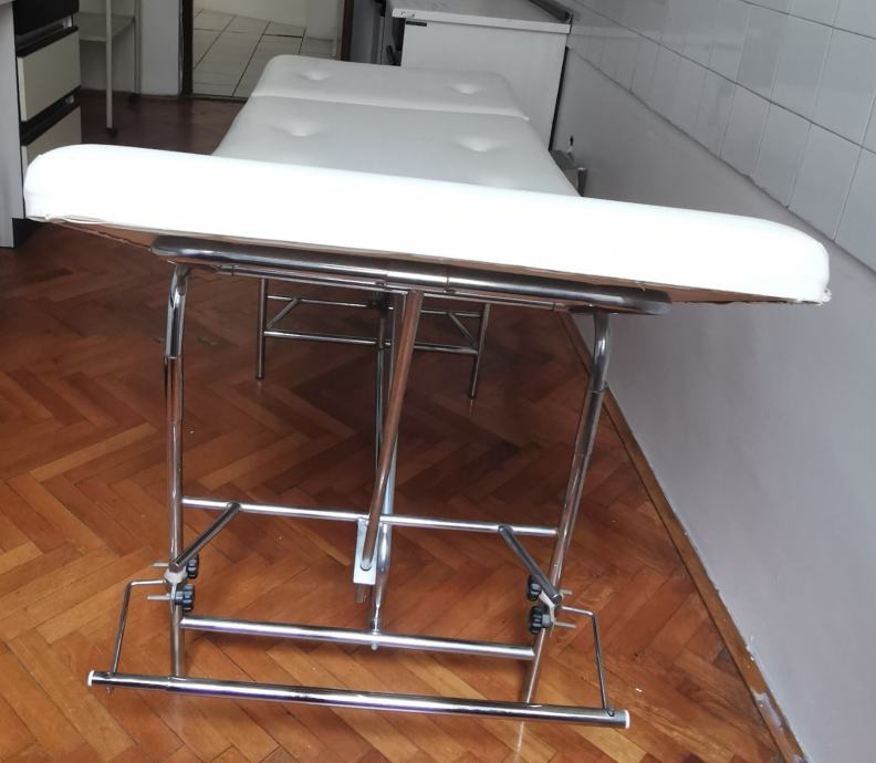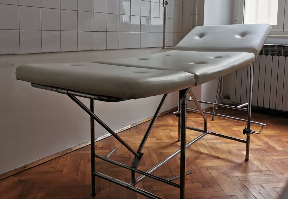 Medicinski ležaj pogodan za kozmetičke tretmane, naslon se podešava ručno, nema hidrauliku, ima stalak za rolu papira,