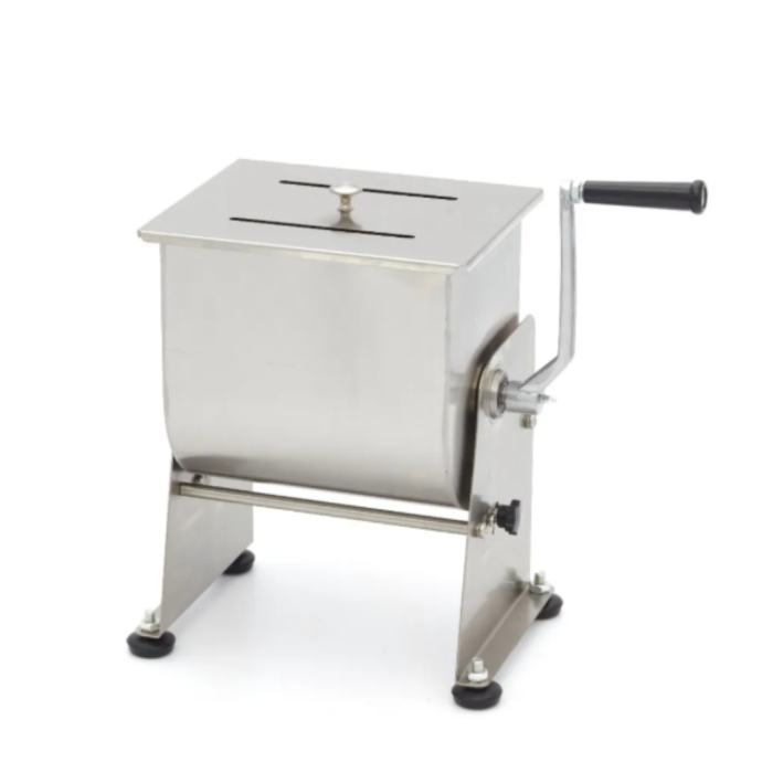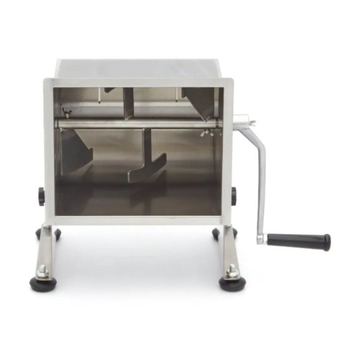 Mešanje u ovoj mešalici od nerđajućeg čelika je veoma jednostavno: otvorite poklopac i napunite posudu željenom količinom mesa ili ribe. Posuda ima kapacitet od 10 litara i pogodna je za obradu od 6,5 do 7,5 kg mesa ili ribe, u zavisnosti od strukture. Nakon dodavanja mesa, možete ubaciti začine poput bilja, orašastih plodova ili povrća. Okrećite ručicu dok ne postignete željenu teksturu mesa ili nadeva. Mešalica se može okretati u oba smera. Nagibna posuda je veoma praktična prilikom pražnjenja sadržaja, a ujedno olakšava i čišćenje. Za stabilnost na gotovo svakoj površini, uređaj je opremljen sa četiri gumene nožice.