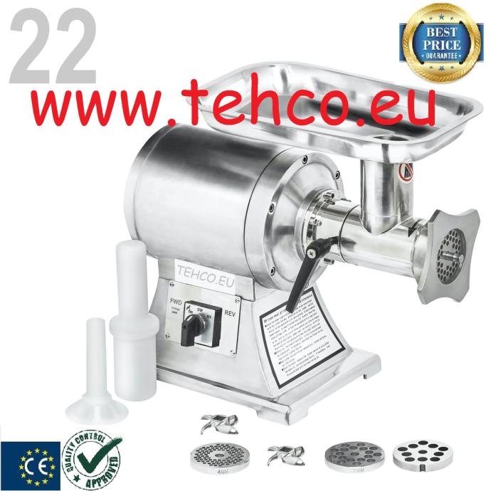 Mesoreznica 22. Izrađen od nehrđajućeg čelika i lijevanog aluminija, stoga zaštićen od korozije. Mesoreznica 22 ima radnu brzinu od 250 kg na sat. Sita s rupama od 4 mm, 10 mm i 14 mm i 2 noža. Vrlo jednostavno čišćenje, jer gotovo da nema ostataka u mesoreznici. Visoka sigurnost je zajamčena. S protukliznim gumenim nožicama siguran položaj je zajamčen. Mesoreznica 22 koristi snažan motor koji impresionira svojim nevjerojatno tihim radom.