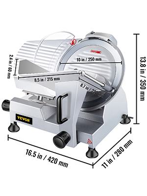 Ova mašina za rezanje mesa ima kućište od lijevanog aluminija i oštricu od kromiranog čelika od 10 inča s lakiranom završnom obradom koja je otporna na koroziju i hrđanje. Snažni motor od 240 W osigurava visoko učinkovitu proizvodnju. Raspon podešavanja debljine: 0-0,47 inča/0-12 mm. Savršen za kućnu i komercijalnu upotrebu.