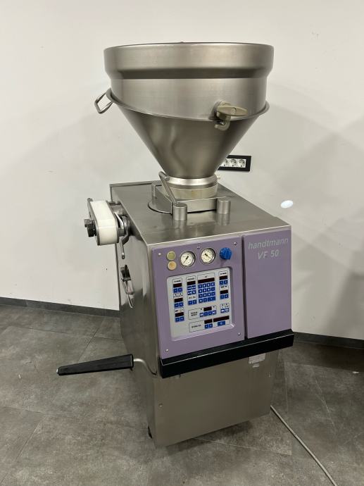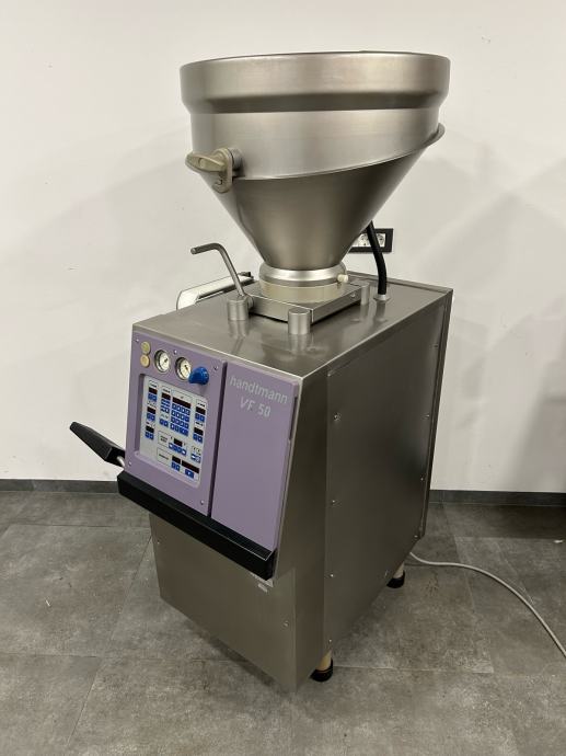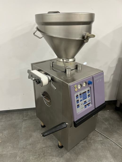 Vakum punilica Handtmann VF50, izuzetno dobro očuvana redovito servisirana. Mogućnost punjenja, porcioniranja(na gram) i parovanja. Punilica je komplet inox, volumen lijevka 80litara, prijenos preko lamela. Punilica je u top stanju, i več je modificiran model (prednji i zadnji poklopac od inoxa).