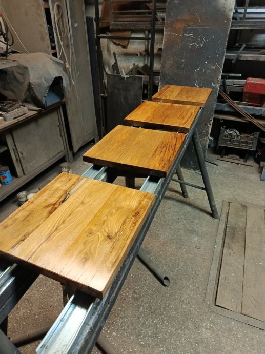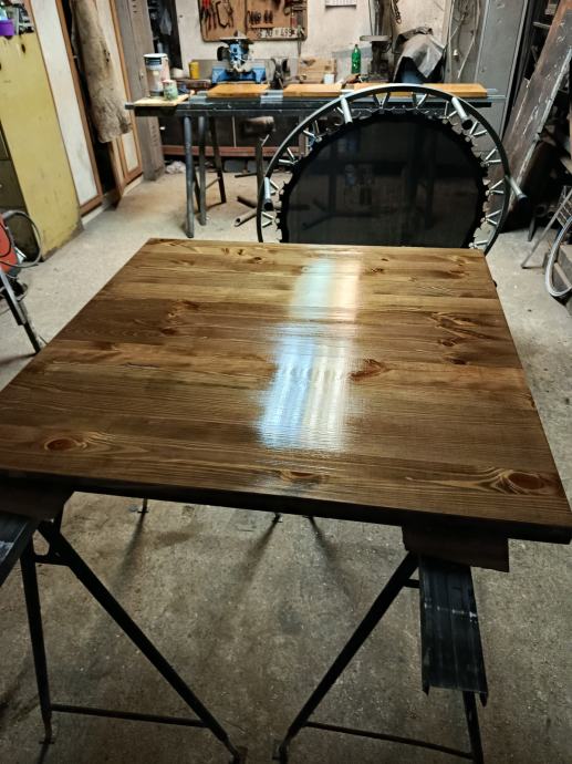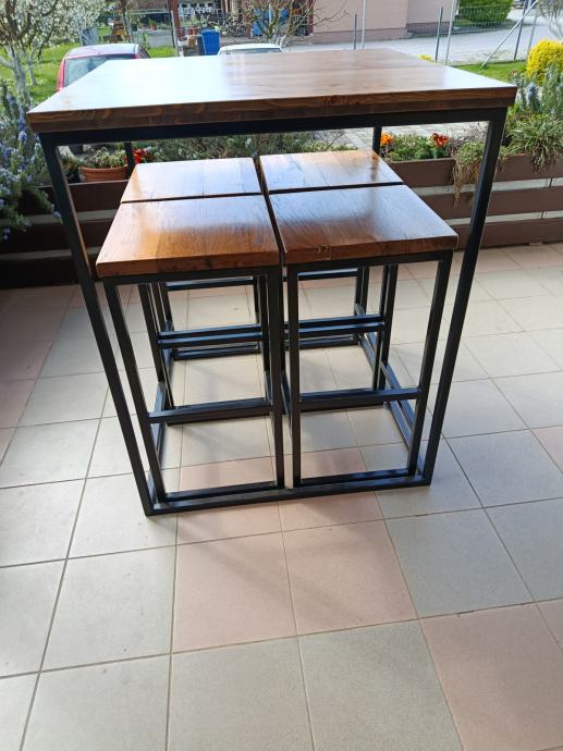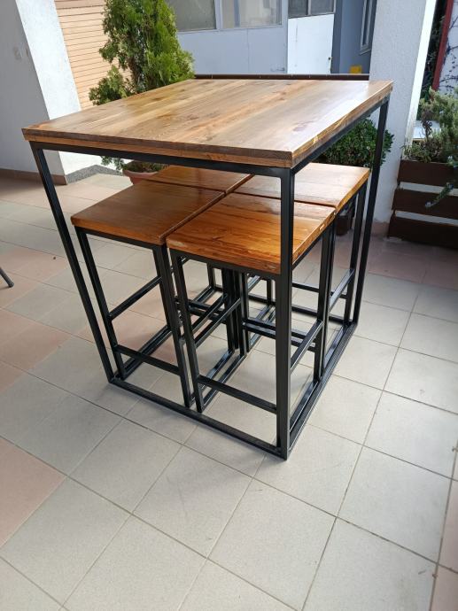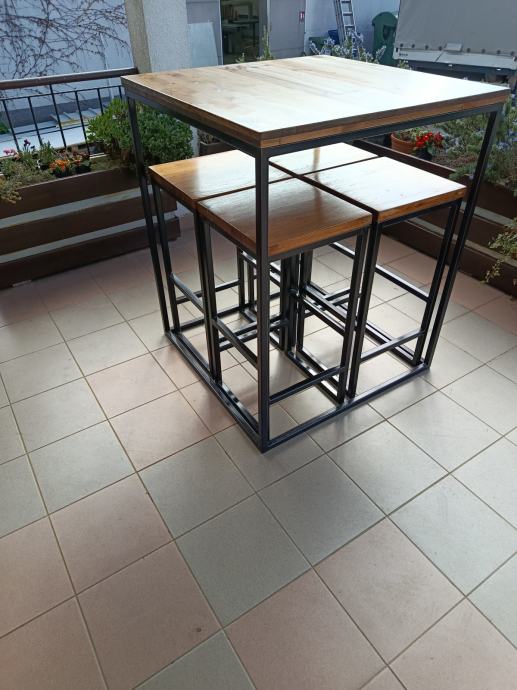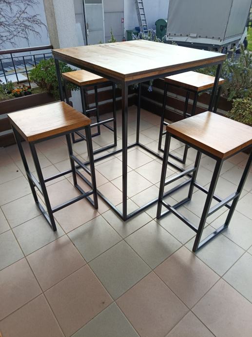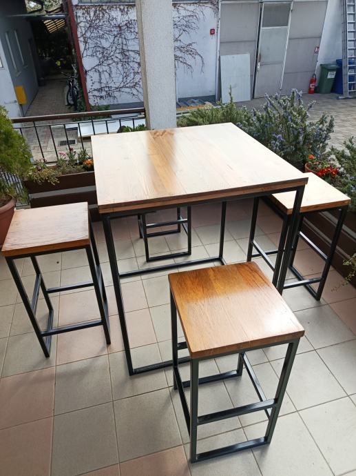Prodajem barski stol sa četiri stolice.Okvir stola i stolica je cijev 25/25/2mm a gornji dio je od punog drveta.Dimenzije stola su d,š,v,890/890/1100 a stolice400/400/800mm.