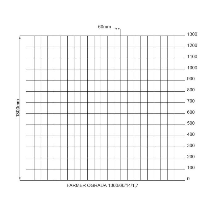 Farmer pletivo koristi se za građenje prostora za uzgoj stoke, peradi i divljači a može se koristiti i za građenje posjeda, vrta voćnjaka i sl. Dimenzije oka i visina farmer pletiva odabiru se prema namjeni. Žica farmer extra je kvalitete čvrsta i postojana a izrađena je tehnikom punktiranja kvalitetne pocinčane tvrde žice debljine 1,6mm. Dimenzije i veličinu oka farmer pletiva možete vidjeti u priloženoj tehničkoj slici.Visina: 1300mmRazmak oka: 60mmDužina bale: 25mDebljina žice: 1,6mm