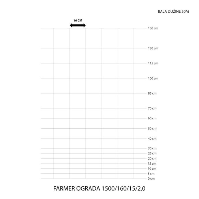 Farmer pletivo koristi se za građenje prostora za uzgoj stoke, peradi i divljači a može se koristiti i za građenje posjeda, vrta voćnjaka i sl. Dimenzije oka i visina farmer pletiva odabiru se prema namjeni. Žica farmer extra je kvalitete čvrsta i postojana a izrađena je tehnikom punktiranja kvalitetne pocinčane tvrde žice debljine 2,0mm. Dimenzije i veličinu oka farmer pletiva možete vidjeti u priloženoj tehničkoj slici.Visina: 1500mmRazmak oka: 160mmDužina bale: 50mDebljina žice: 2,0mm