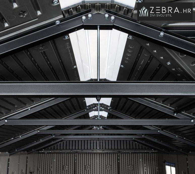 Masivne čelične grede na krovu i bočnim zidovima pružaju dodatnu stabilnost. Ova vrtna kućica impresionira ne samo svojim prvoklasnim svojstvima materijala, već i svojim velikodušnim prostorom za pohranu, visokokvalitetnim značajkama i niskim zahtjevima za održavanje. Široka dvostruka vrata, u kombinaciji s bočnim ulazom, osiguravaju jednostavan pristup vrtnom alatu i ostaloj opremi.
