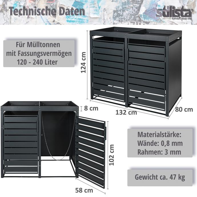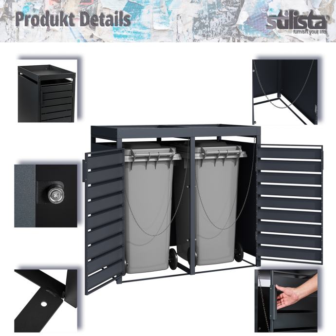 Naša STILISTA obloga za kante za smeće nudi prostor za kante za smeće zapremine do 240 litara. Vrhunac metalne kutije je krov za sadnju, koji možete ukrasiti prema vlastitim željama i zamislima. Ventilacijski otvori osiguravaju dovoljnu cirkulaciju zraka. Time se sprječavaju neugodni mirisi u kutiji za smeće. Kutija za smeće dostupna je za jednu, dvije, tri ili četiri kante za smeće.