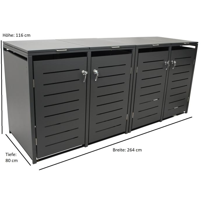 Dimenzije (DxŠxV): 265 x 80 x 116 cm, materijal: metal presvučen prahom, kapacitet: 80 do 240 litara po odjeljku (isporučuje se u 4 paketa)