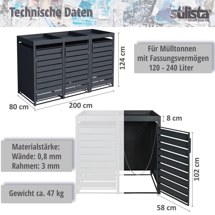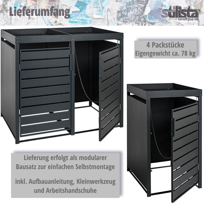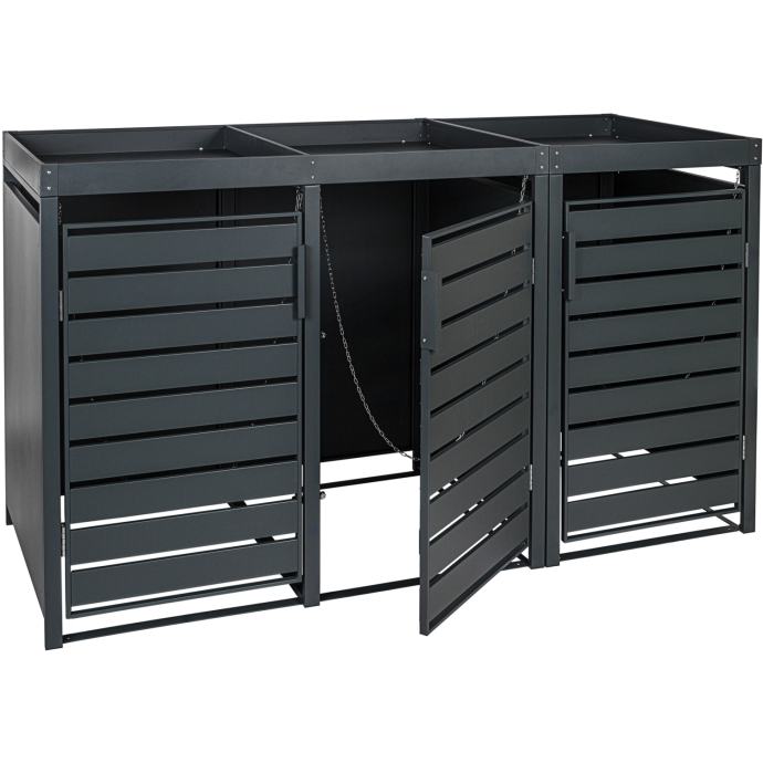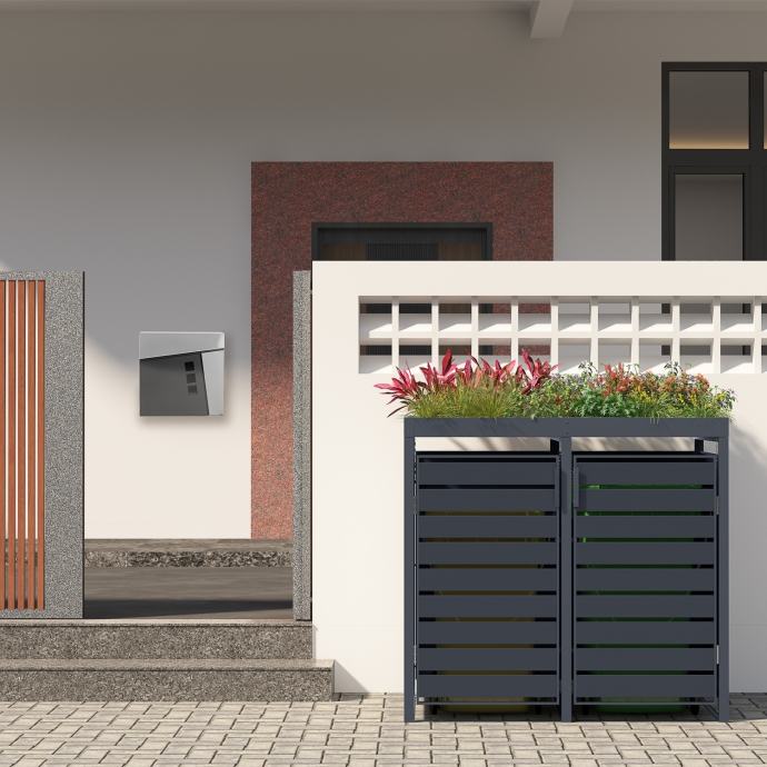 Naša STILISTA obloga za kante za smeće nudi prostor za kante za smeće zapremine do 240 litara. Vrhunac metalne kutije je krov za sadnju, koji možete ukrasiti prema vlastitim željama i zamislima. Ventilacijski otvori osiguravaju dovoljnu cirkulaciju zraka. Time se sprječavaju neugodni mirisi u kutiji za smeće. Kutija za smeće dostupna je za jednu, dvije, tri ili četiri kante za smeće.