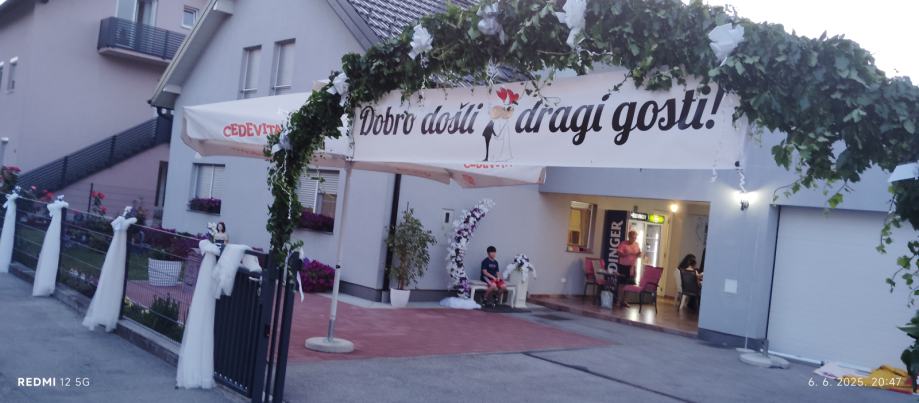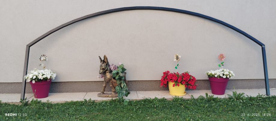 Prodaje se poluluk za ulazna vrata kod svadbenih svećanosti. Napravljen je željeznih cijevi. Dužina luka je 465 cm, bokovi su 100 cm, visina na središnjem dijelu je 175 cm. Korišteno je jedanput. Na fotografiji je vidljivo kako izgleda kada je okićeno.