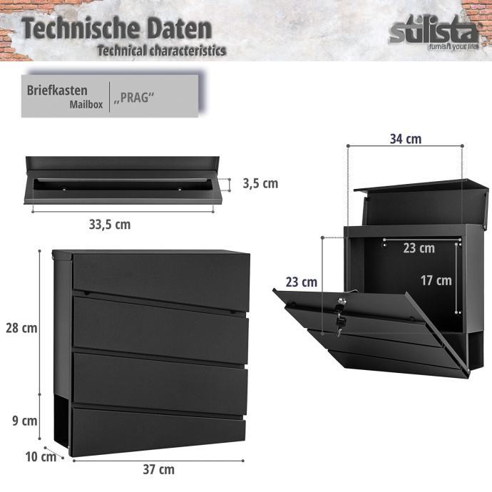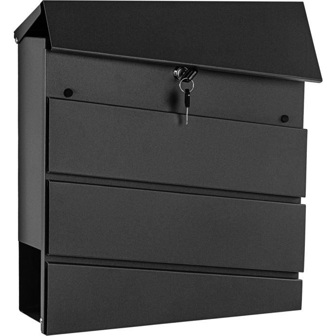 Dimenzije: Tijelo (ŠxVxD): 37 x 37 x 10 cm, Veličina otvora (ŠxV): 33,5 x 3,5 cm, Rola novina: 36,5 cm x 8 cm x 9 cm, Materijal: metal presvučen prahom, Uključuje dva ključa, bušilice na leđima