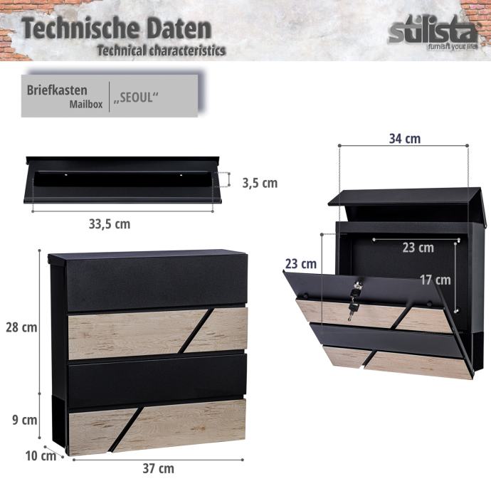 Dimenzije: Tijelo (ŠxVxD): 37 x 37 x 10 cm, Veličina otvora (ŠxV): 33,5 x 3,5 cm, Rola novina: 36,5 cm x 8 cm x 9 cm, Materijal: metal presvučen prahom, Uključuje dva ključa, bušilice na leđima