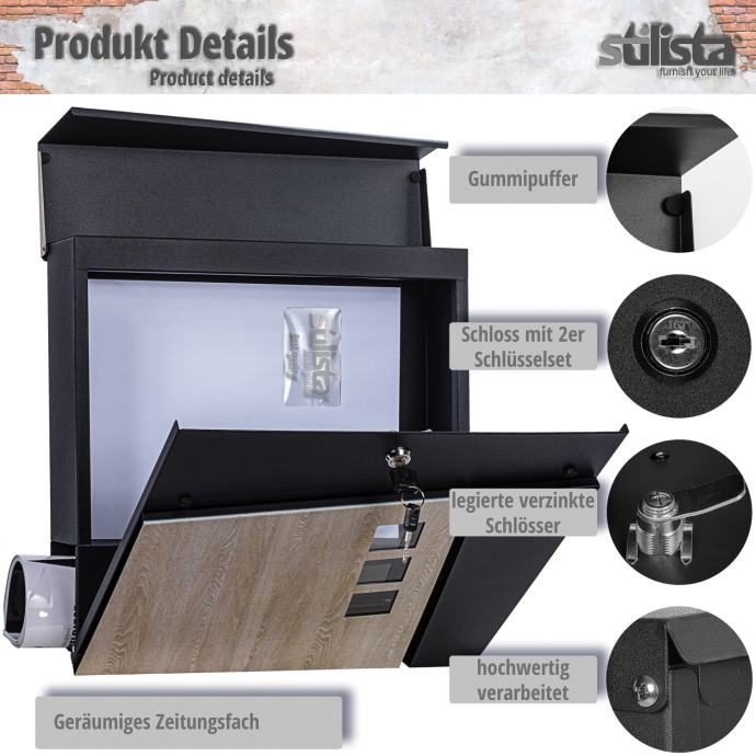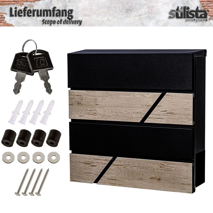Naš STILISTA zidni poštanski sandučić 37 x 37 x 10 cm u izgledu drva od čelika obloženog prahom dostupan je u četiri različita modela i po dvije boje. Poštanski sandučić ima veliki otvor za pisma dimenzija 33,5 x 3,5 cm i stoga je pogodan i za velika pisma i deblje koverte. Također nudi zasebnu rolu novina dimenzija 36,5 x 8 x 9 cm. Zahvaljujući bravi i ključu uključenim u isporuku, vaša pisma i razglednice su sigurno pohranjeni.