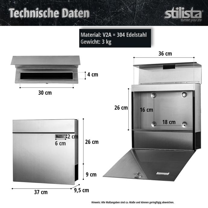 4 probušene rupe za pričvršćivanje poštanskog sandučića na poleđini Materijal: brušeni V2A nehrđajući čelik