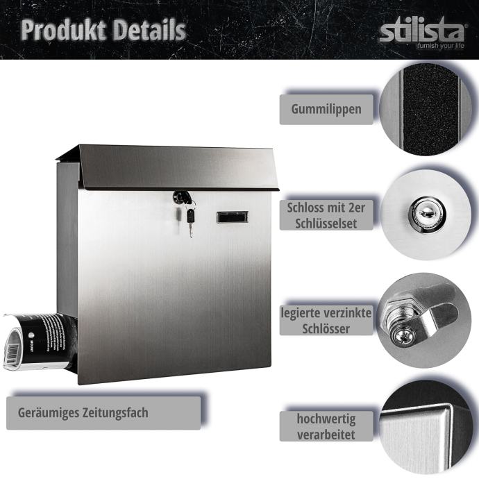 Naš zidni sandučić STILISTA izrađen od visokokvalitetnog nehrđajućeg čelika dostupan je u tri različita modela. Poštanski sandučić ima veliki otvor za pisma te je stoga pogodan i za velika pisma i deblje kuverte, a nudi i odvojenu rolu novina. Zahvaljujući bravi i ključu uključenim u isporuku, vaša pisma i razglednice su sigurno pohranjeni.