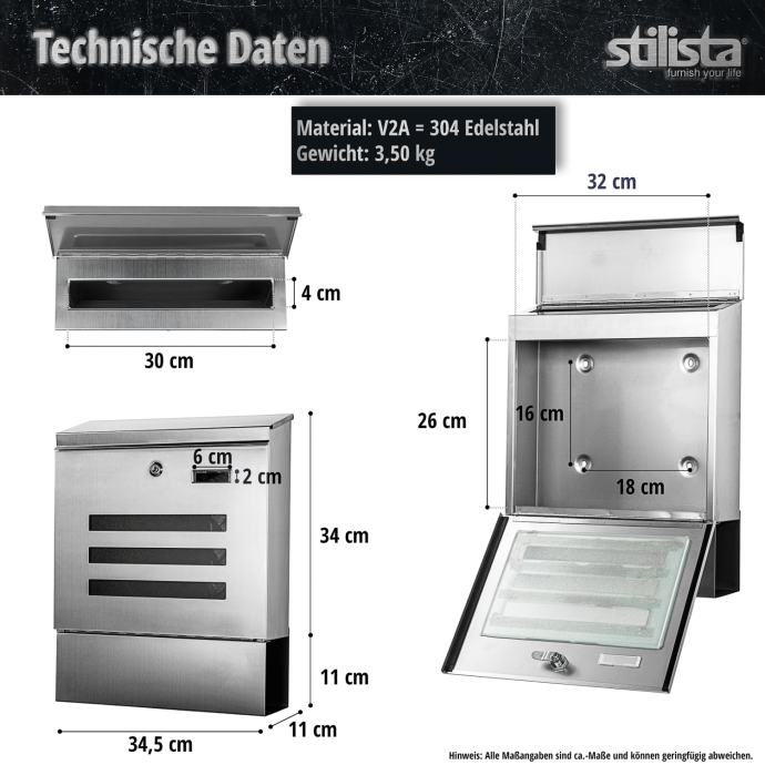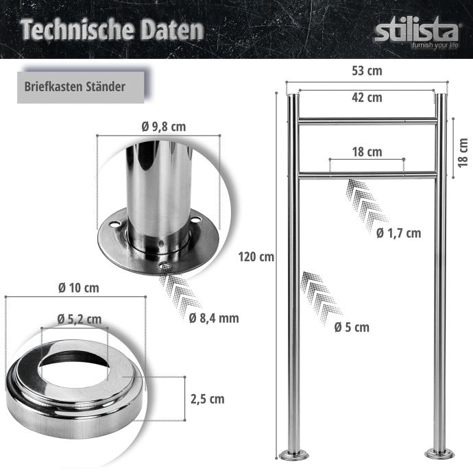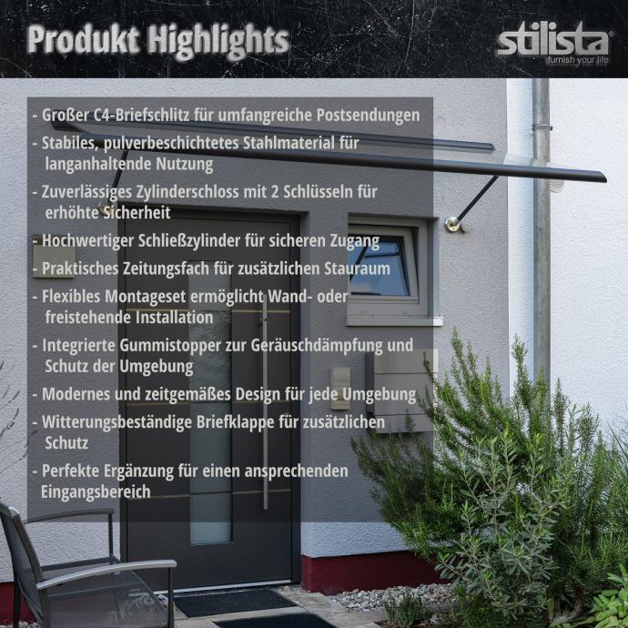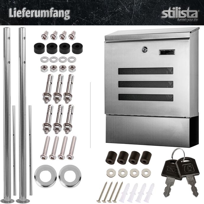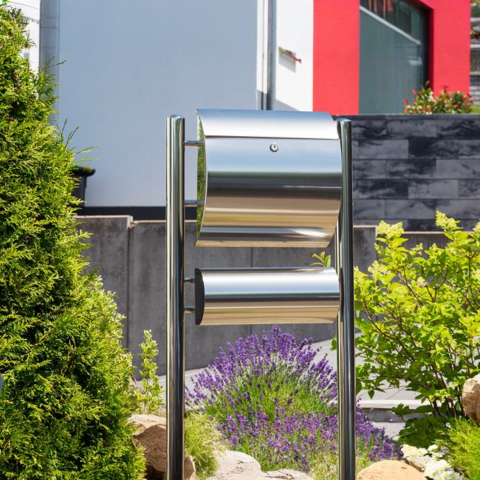 Naš STILISTA stojeći poštanski sandučić ima postolje, poštanski sandučić i stalak izrađeni su od visokokvalitetnog nehrđajućeg čelika i dostupni su u četiri različita modela. Poštanski sandučić ima veliki otvor za pisma te je stoga pogodan i za velika pisma i deblje kuverte, a nudi i odvojenu rolu novina. Zahvaljujući bravi i ključu uključenim u isporuku, vaša pisma i razglednice su sigurno pohranjeni.
