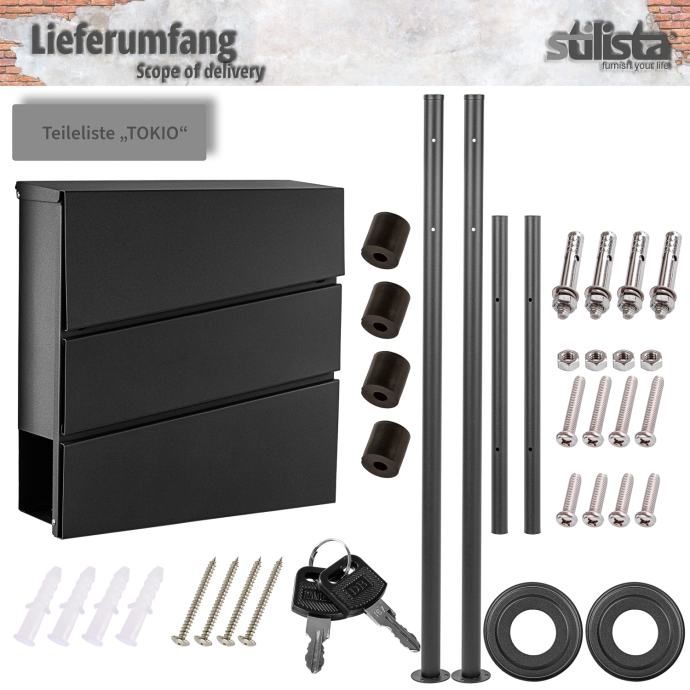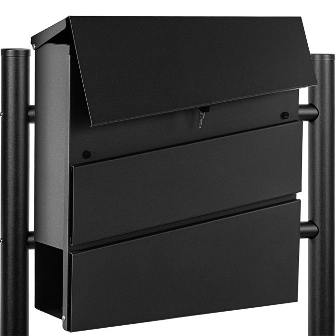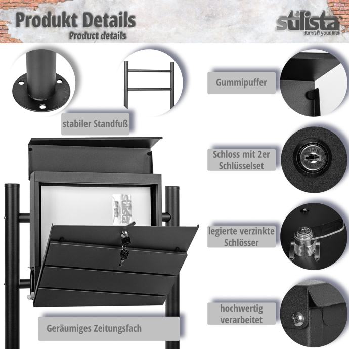 Naš STILISTA samostojeći poštanski sandučić ima postolje s dvije noge od čelika obloženog prahom ili nehrđajućeg čelika. Poštanski sandučić je dostupan u šest različitih modela iu dvije boje. Poštanski sandučić ima veliki otvor za pisma dimenzija 33,5 x 3,5 cm i stoga je pogodan i za velika pisma i deblje koverte. Također nudi zasebnu rolu novina dimenzija 36,5 x 8 x 9 cm. Zahvaljujući bravi i ključu uključenim u isporuku, vaša pisma i razglednice su sigurno pohranjeni.