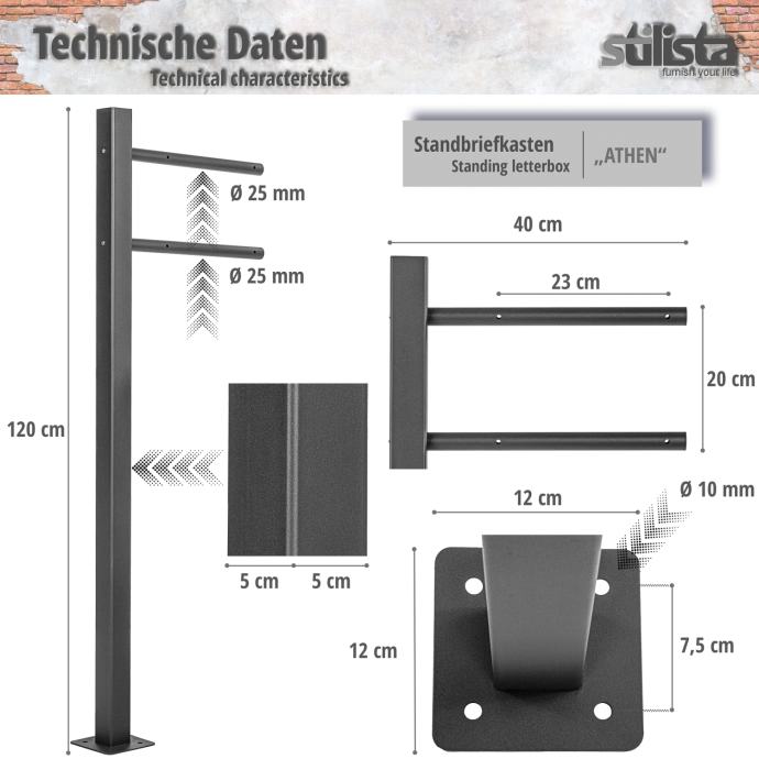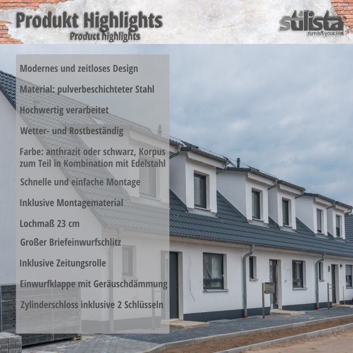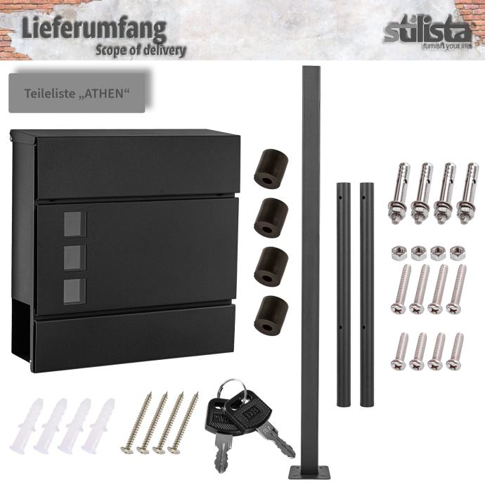 Naš STILISTA samostojeći poštanski sandučić ima postolje s nogom od čelika obloženog prahom. Poštanski sandučić dostupan je u šest različitih modela u dvije boje. Poštanski sandučić ima veliki otvor za pisma dimenzija 33,5 x 3,5 cm i stoga je pogodan i za velika pisma i deblje koverte. Također nudi zasebnu rolu novina dimenzija 36,5 x 8 x 9 cm. Zahvaljujući bravi i ključu uključenim u isporuku, vaša pisma i razglednice su sigurno pohranjeni.