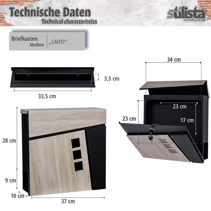 Naš samostojeći sandučić STILISTA ima postolje s dvije noge izrađeno od čelika obloženog prahom; poštanski sandučić dostupan je u četiri različita modela. Poštanski sandučić ima veliki otvor za pisma dimenzija 33,5 x 3,5 cm i stoga je pogodan i za velika pisma i deblje koverte. Također nudi zasebnu rolu novina dimenzija 36,5 x 8 x 9 cm. Zahvaljujući bravi i ključu uključenim u isporuku, vaša pisma i razglednice su sigurno pohranjeni.
