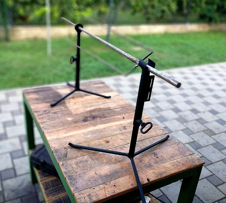 Na osovinu ražnja moguće je spojiti aku bušilicu i tako narediti rotaciju. Ražanj sa strane ima u dvije šipke za fiksiranje mesa