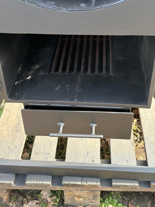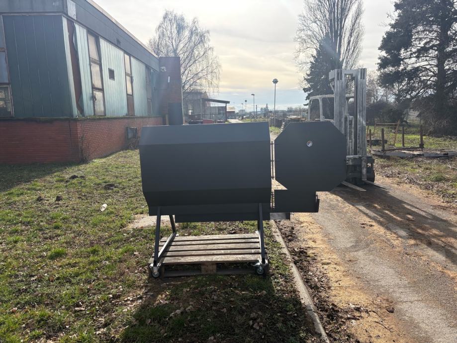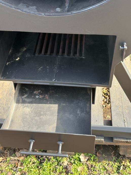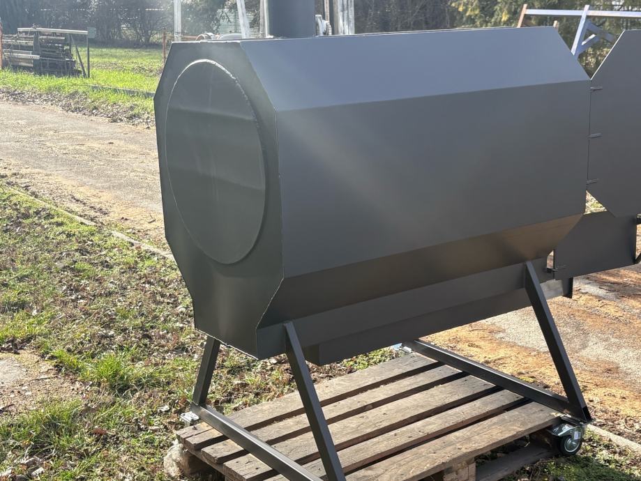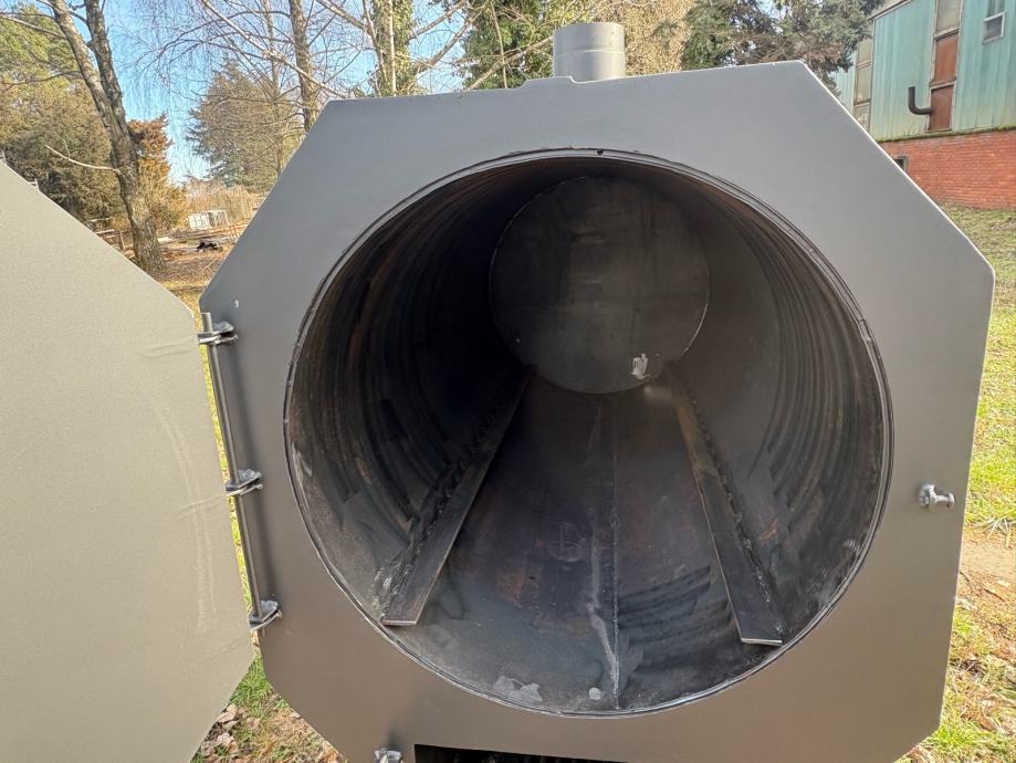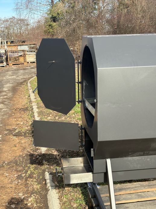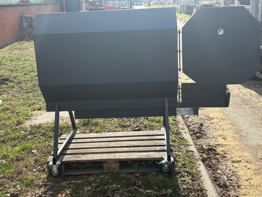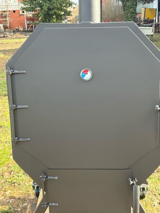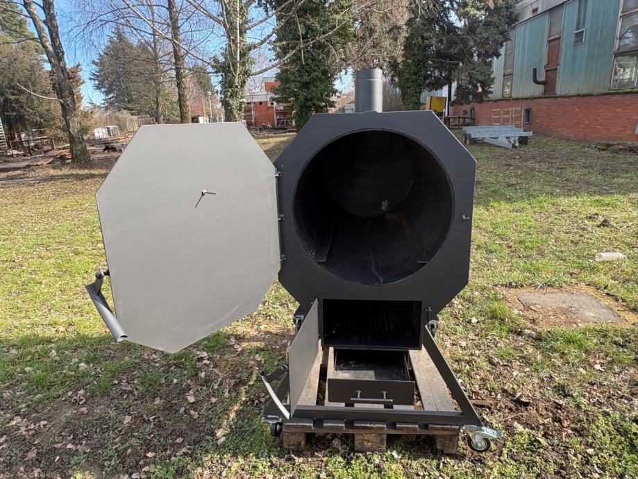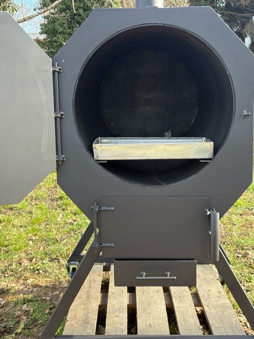 Prodajem novi roštilj/pečenjaru izrađenu od metala, sive boje. Radi se o masivnoj i prostornoj pećnici cilindričnog oblika s oktagonnalnim prednjim poklopcem koji se otvara na šarke. Unutrašnjost je velika i duboka, pogodna za pečenje cijele prasetine ili janjetine na ražnju. Na dnu se nalazi odvojiva ladica za pepeo koja se lako izvlači, a ispod rešetke ima dovoljno prostora za loženje. Uređaj stoji na metalnom postolju s kotačićima koji omogućuju lagano premještanje. Na vrhu se nalazi dimnjak za odvod dima. Solidna izrada od debljeg lima, sve je vareno i čvrste konstrukcije.