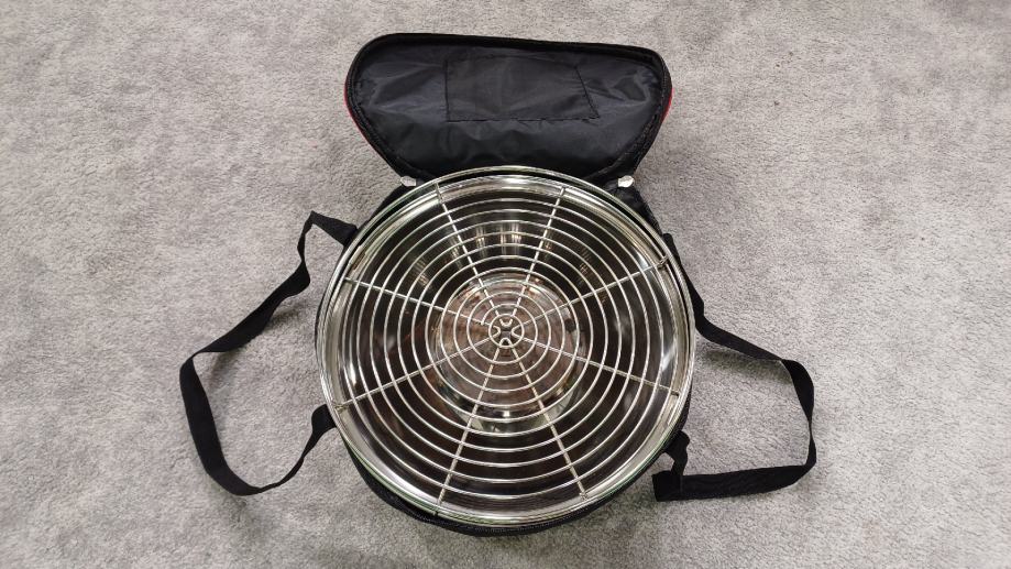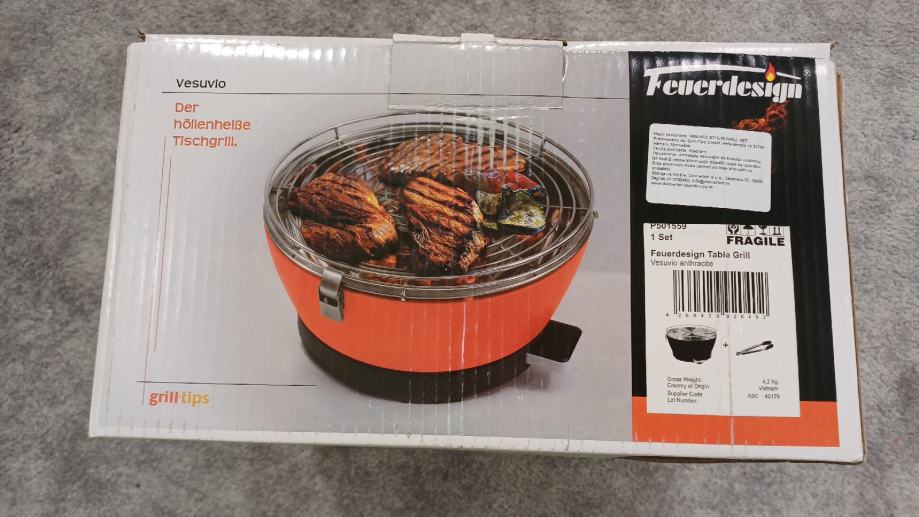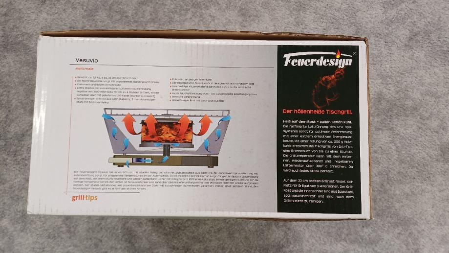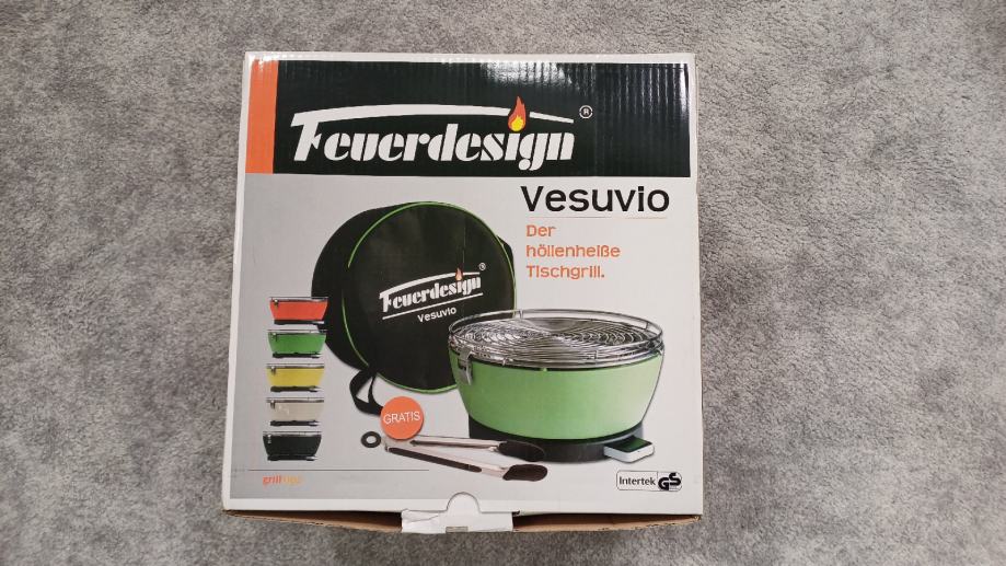 Vesuvio Feuerdesign stolni roštilj sa izmjenjivim i punjivim (Micro USB) ventilatorom za prikladan i brz start i podešavanje temperature. Grill rešetka, unutarnja školjka i poklopac košare plamenika izrađeni su od nehrđajućeg čelika i lako se mogu očistiti u stroju za pranje posuđa. Dolazi sa praktičnom torbicom za nošenje. Prikladno za do 4 osobe a težak je samo 3,5 kg. Vrlo jednostavan za rukovanje i spreman za brzu upotrebu.
