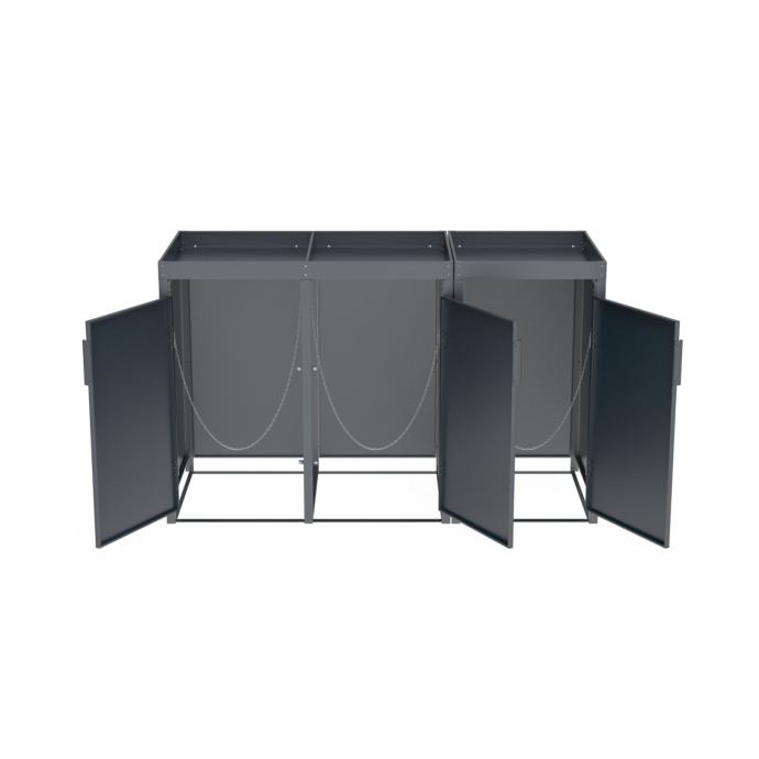 Šupa je prikladna za tri male kante za smeće od 120 litara ili tri velike kante za smeće od 240 litara (standardne veličine).