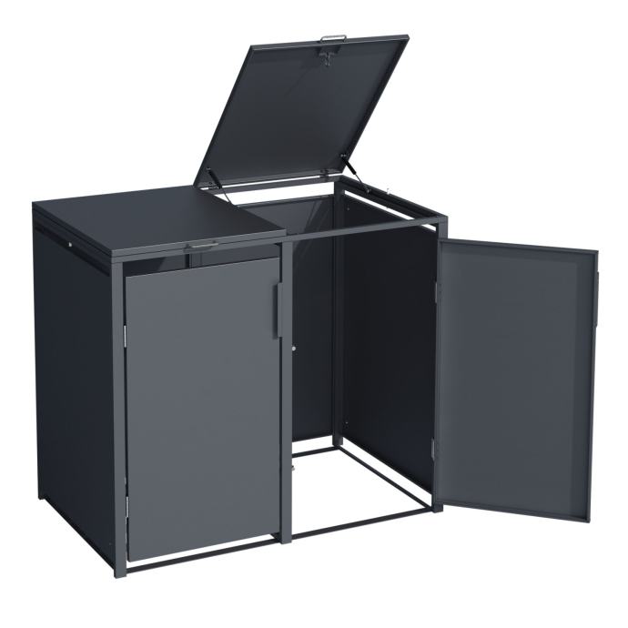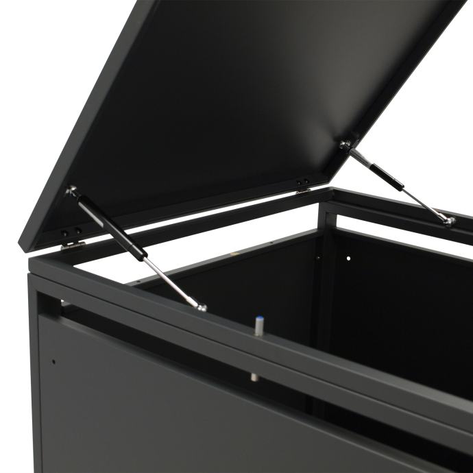 Prednja vrata imaju magnetsko zatvaranje. Gornji poklopci opremljeni su plinskim oprugama za lakše rukovanje. Poklopac kante za smeće može se pričvrstiti na poklopac šupe pomoću remena, tako da se poklopac automatski otvara kada se poklopac šupe otvori. Svi spojni elementi i vijci izrađeni su od nehrđajućeg čelika.