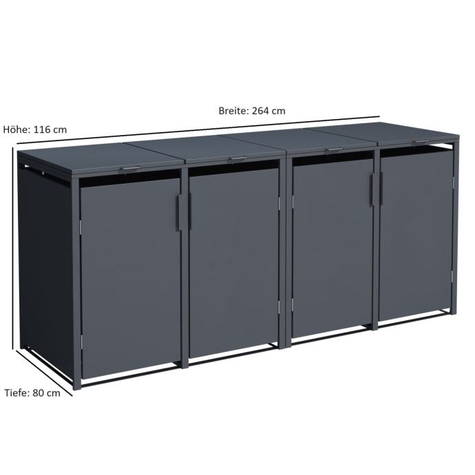 Šupa može primiti četiri male kante za smeće od 120 litara ili velike kante za smeće od 240 litara (standardne veličine).