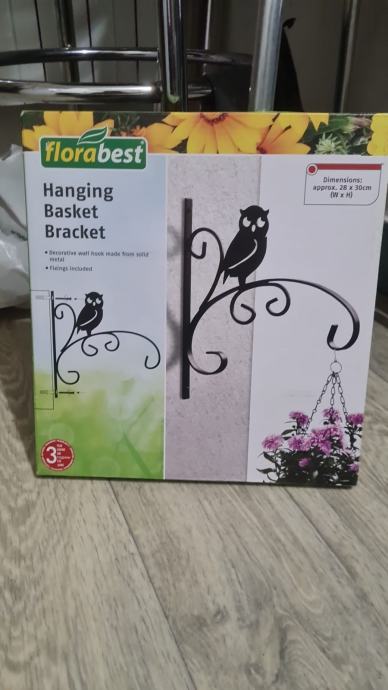 Novi metalni stalak za cvijeće, neotvoren, u paketu i oprema za montažu.