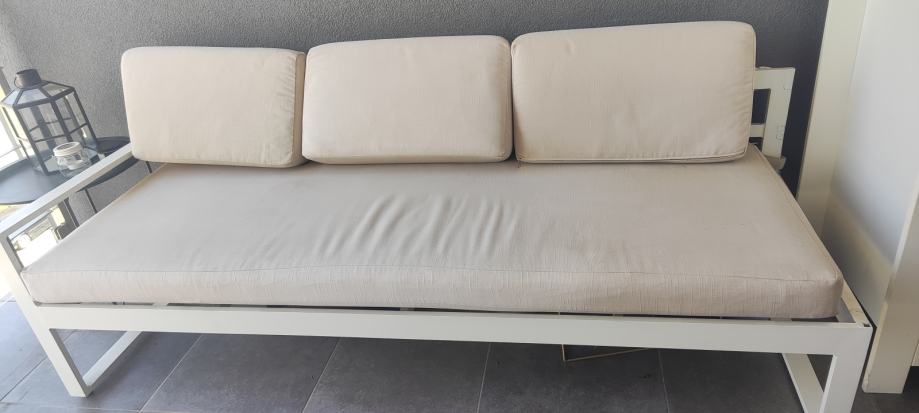 Klupa za sjedenje za balkon/terasu sa bež jastucima (perive navlake). Dimenzije 170*90cm.