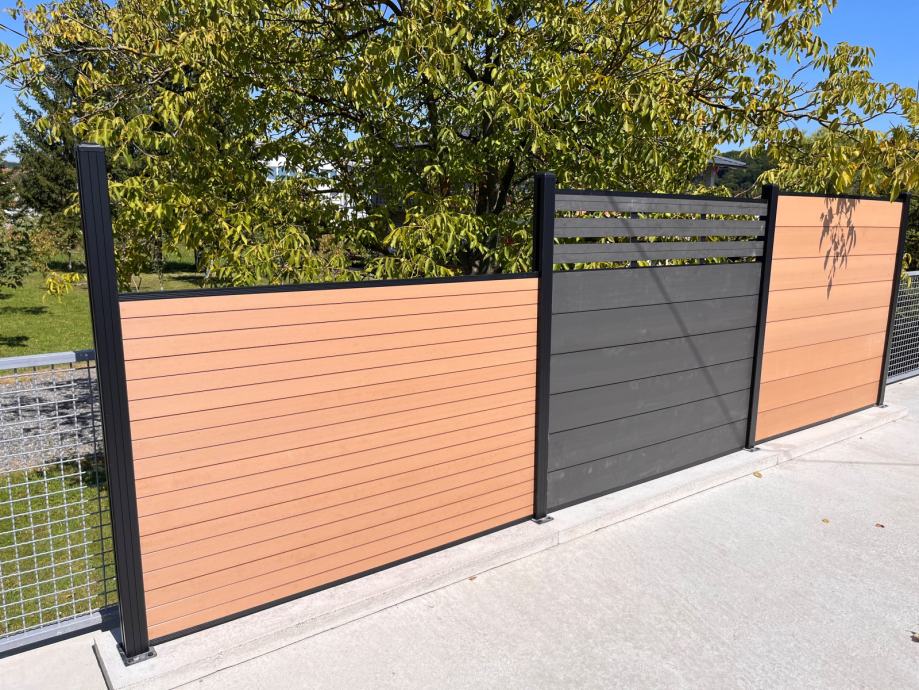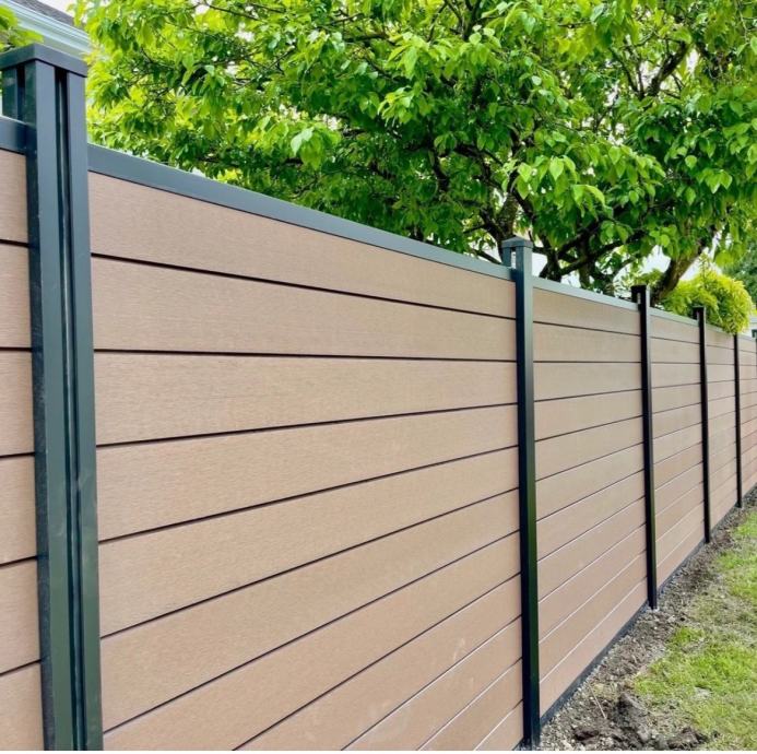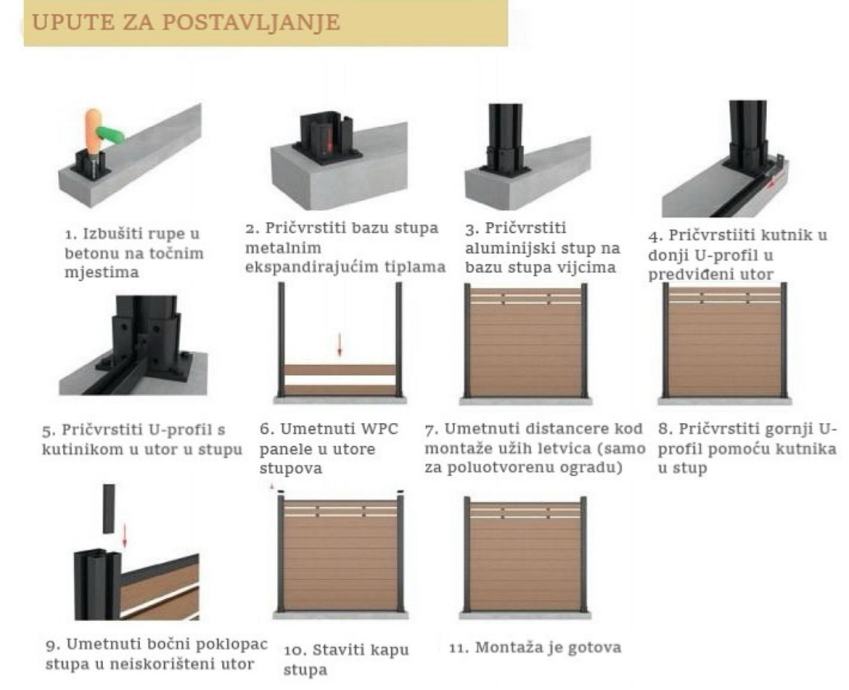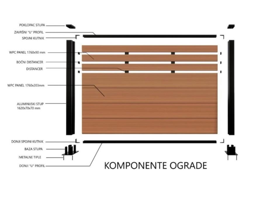 Visokokvalitetne WPC (kompozit plastike i drvenih vlakana) ograde koje su sačinjene od kompozita drvenih vlakana s ekološki prihvatljivim polimerom u kombinaciji sa aluminijskim stupovima i profilima. Imamo više modela i boja ograda i vrata u više dimenzija. Dvije boje (Teak i Stone Grey- antracit) odmah dostupne na lageru.