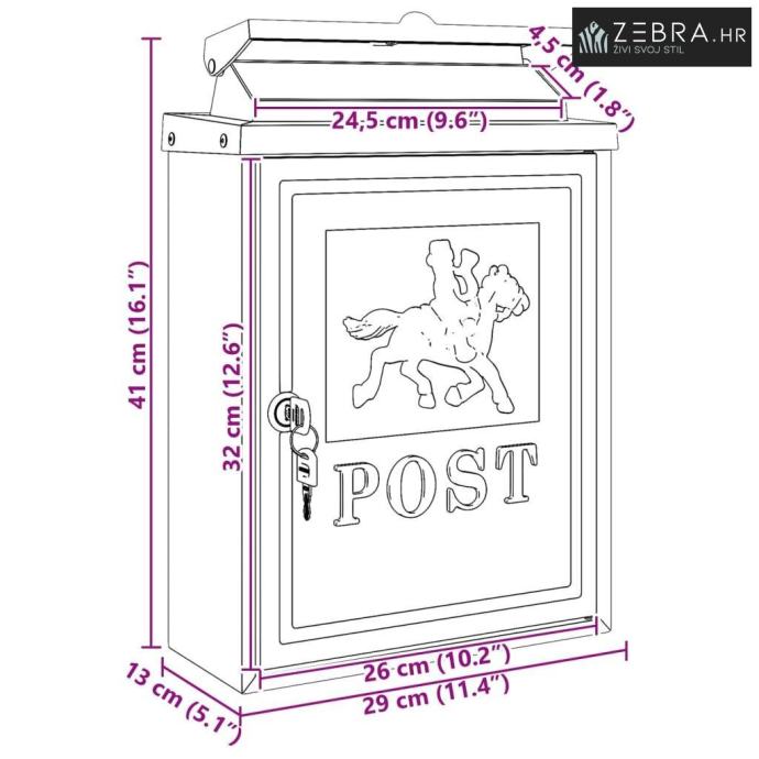 Preporučena upotreba: Vintage zidni poštanski sandučić je odličan za vrtove i terase, gdje može poslužiti i kao funkcionalan sandučić za mail i dekorativni komad. Bez obzira na to je li u privatnim kućama ili zajedničkim prostorima, njegov elegantan dizajn savršeno se uklapa u različite stilove, dodajući šarm svakom ulazu.