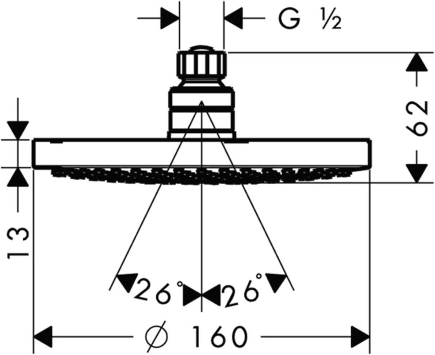 Veličina glave tuša: 160 mm, vrste mlaza: Rain. Količina protoka Rain mlaza (pri 3 bara): 17 l/min. Kromirana pločica za oblikovanje mlaza, materijal pločice za oblikovanje mlaza: plastika. Montaža: Strop ili zid. Priključni navoj G½.