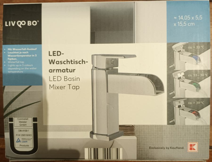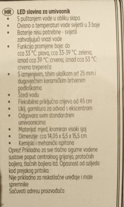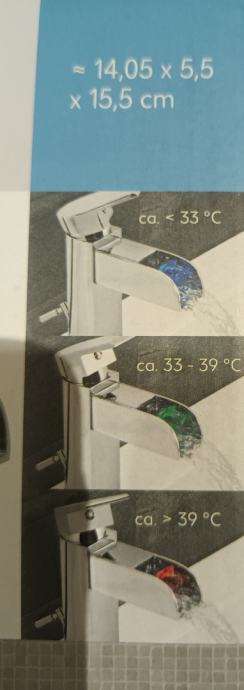 Prodajem novu zapakiranu mješalicu za umivaonik s puštanje u obliku slapa i izmjenom boja kod promjene temperature vode i priborom za montažu.