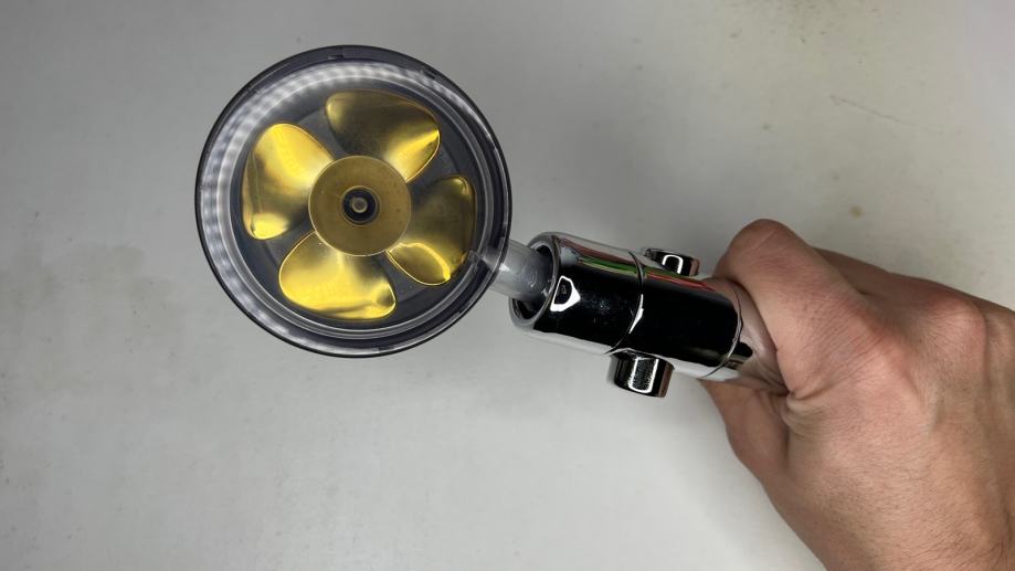 Tuš slusalica, sa jakim mlazom i velikim obimom vode, opustajuci mlaz koji se ispreplice jedan preko drugog, u sebi sadrzi propeler za dodatnu snagu, a posto je proziran dobija dodatan car i zadovoljstvo tokom tusiranja. Propeler zlatne boje se vrti, a kad se stisne tipka stop mlaz se zaustavlja, no voda ostaje u cijevi i na cekanju. Na taj nacin stedite vodu i vrijeme pronalaska omiljene topline vode kod ponovnog ukljucivanja