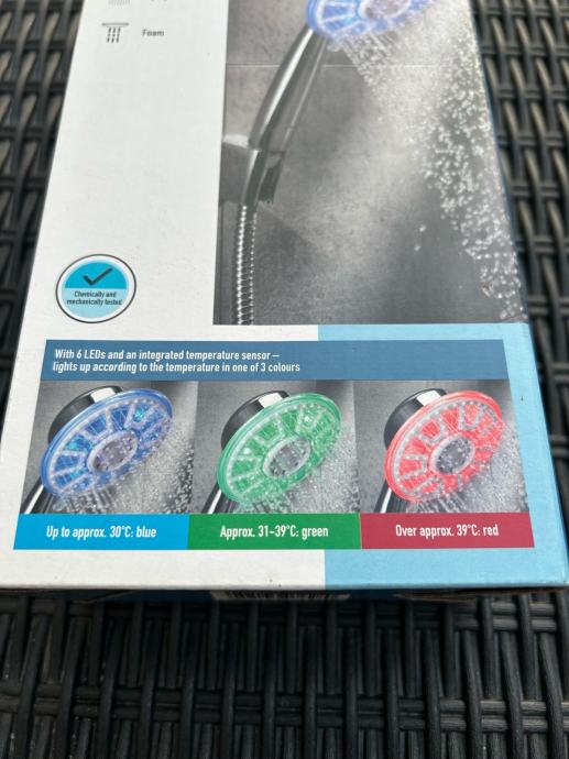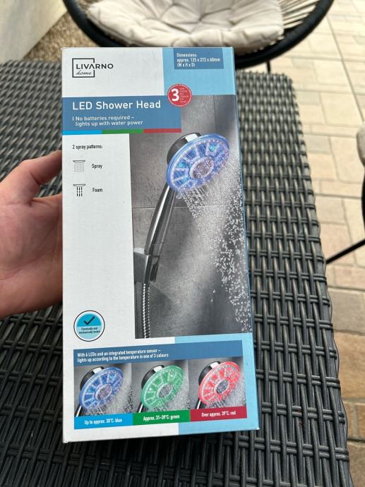 LED tuš mjenja boju vode u odnosu na njezinu temperaturu, do 25C, od 26C-35C i iznad 36C i na taj način stvara jedan potpuno drugačiji doživljaj tuširanja.