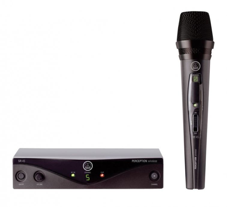 AKG PW 45 Perception Vocal set je bežični mikrofonski komplet koji dolazi s ručnim mikrofonom HT45 (odašiljač) kardioidne usmjerne karakteristike. izrazito transparentan vokalni mikrofon . Uređaj radi izvan 4 i 5 G mreže besprijekorno .