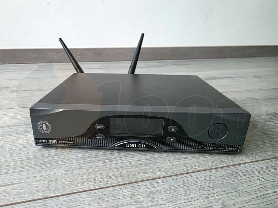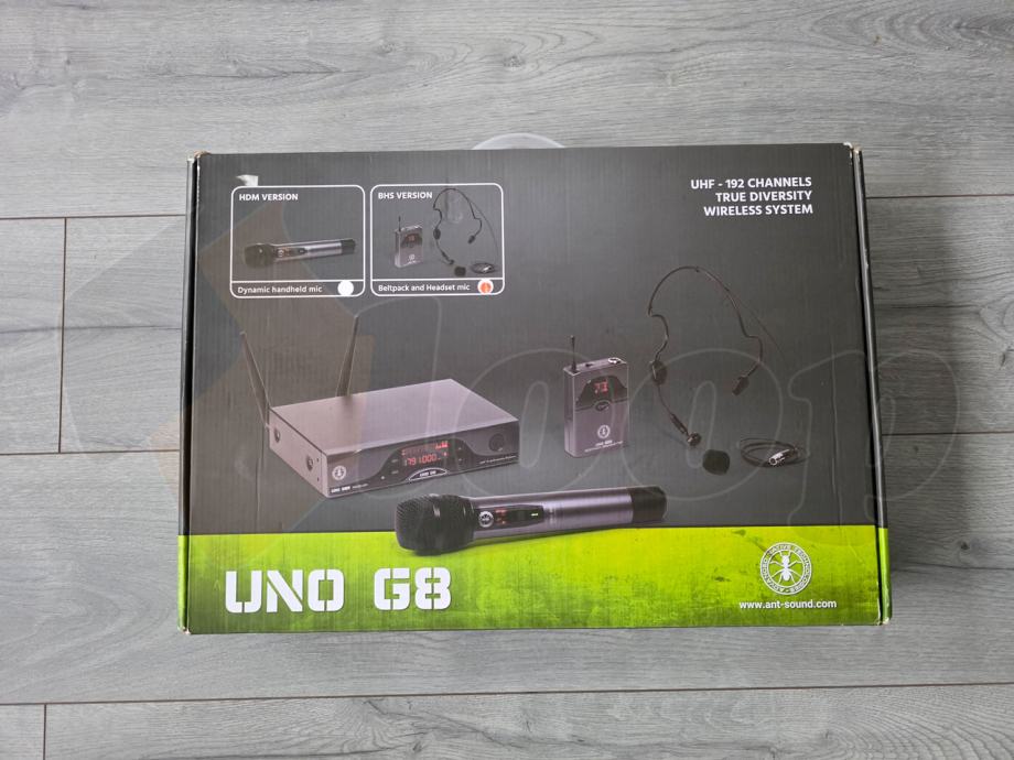 naglavni mikrofon s odašiljačem i prijemnikom pruža Vam profesionalne audio performanse sa širim dinamičkim rasponom i prirodnim zvukom koji apsolutno nema distorzije. UNO G8 prijemnik koristi True Diversity tehnologiju, opremljen je s dvije diskretne antene (A i B) koje vrše selekciju u svakom trenutku kako bi zaprimili najbolji mogući radio signal. Sistem radi na UHF 1785 - 1800 MHz frekvenciji sa 192 selektivna kanala. Odašiljač je opremljen s LCD ekranom koji Vam omogućava jednostavnu selekciju frekvencije i sinkronizaciju između prijemnika i odašiljača. LCD ekran također Vam omogućava potpunu kontrolu nad sistemom, prikaz kanala, grupe i broja funkcija uključujući status baterije, mute on/off, squelch kontrolu za suzbijanje šuma.