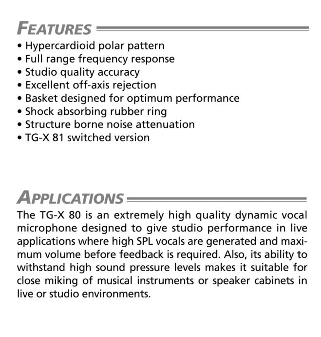 Beyerdynamic TG-X 80 dinamički hypercardioid pjevački mikrofon idealan za male bine jer ima ogroman prag odbacivanja pozadinske buke što ga čini idealnim i za bine s monitorima kao i ako koristite in ear monitoring.