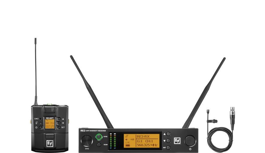 RE3 receivers and transmitters are available in five pre-packaged bodypack transmitter sets, configured to cover a wide range of performance and presentation applications. Sets contain one 1/2-rack-space diversity receiver with antennas, a universal power supply, a rack mount kit, a bodypack transmitter, batteries, and most contain an input device.