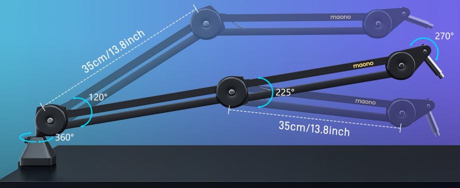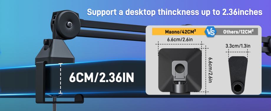 •【Try Upgraded MAONO Boom arm Keep Your Microphone Securely】The Maono BA37 boom arm offers smooth and silent adjustments.With exceptional reach and flexibility,this boom arm is ideal for capturing impeccable vocals,and its thicker metal construction ensures excellent stability even when loaded with a heavy microphone.Boasts an impressive load capacity of 5.5 lbs,Enhanced Load-bearing 25% than similar products on the market.Upgraded C-Clamp support a desktop thinckness up to 2.36inches/6.5cm.
