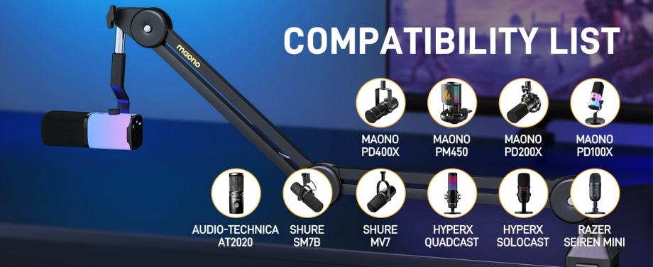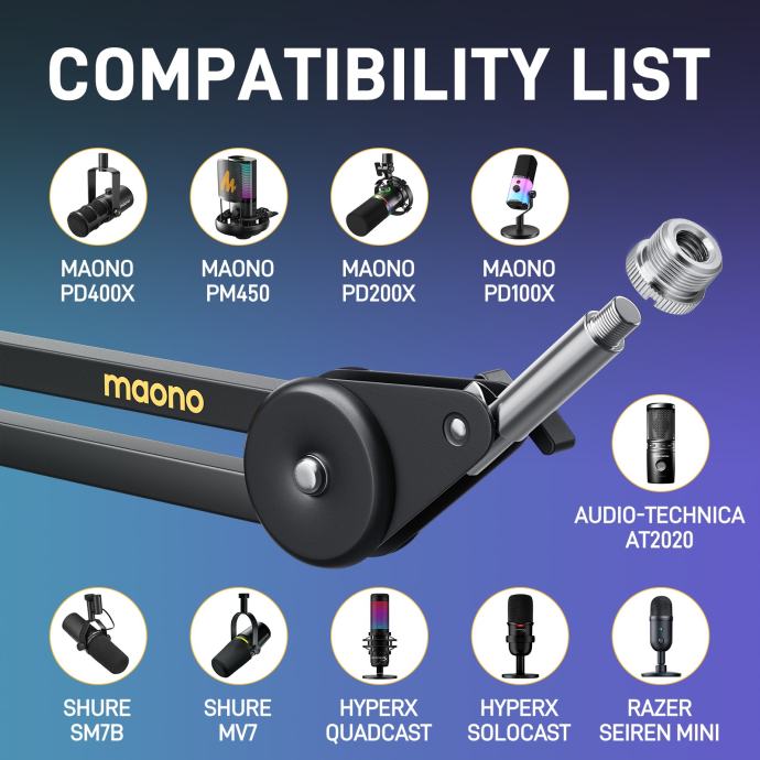 •【Strong Compatibility Boom Arm】MAONO BA37 microphone arm stand features a 5/8" to 3/8" screw adapter,compatible with many brands of microphones and shock mount on the market.Including MAONO PD100X,PD200X,PM450,PD400,PM500,Fifine AM8,AmpliGame(A6V,A8),AM8,HyperX QuadCast,HyperX Solocast,Blue Snowball,Shure MV7,Shure SM58,Shure SM7B,AT2020,AT2035,etc.MAONO BA37 microphone boom arm is very friendly to studio, recording, podcasting,gaming.