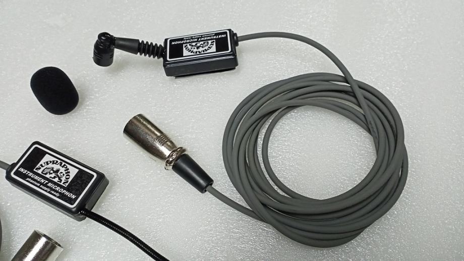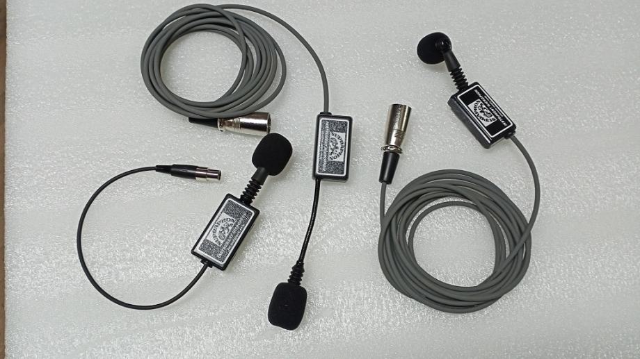 Kondenzatorski mikrofon namijenjen za brzo ozvučavanje prvenstveno žičanih akustičnih instrumenata ili harmonike prodajem za 40 eura fiksno. Montaža na instrument je uz pomoć čička a spajanje na razglas je direktno na mikrofonski ulaz sa fantom napajanjem ili na džepni odašiljač bežičnog sistema. Vlastiti kabel od 3 metra dovoljan je ako se svira u bendu a na sceni tonmajstor će vas lako spojiti na svoj dugi mikrofonski kabel dok je u verziji za bodypack dužina kabela po dogovoru a isto tako i utikač na kraju. Uređaj dolazi u 4 verzije, prva je kratka gdje mikrofon gleda prema dolje, a na drugoj se položaj mikrofona može mijenjati, treća gdje mikrofon kakođer gleda prema dolje ali je spušten do ravnine podloge (recimo za bas stranu harmonike) i posebno bih vašoj pažnji preporučio četvrtu verziju mikrofona, a to je vrhunska letvica za harmoniku predviđena za direktno spajanje na džepni odašiljač po cijeni od 80 eura (zadnje 4 fotografije). Kad kažem vrhunska mislim na odličnu pokrivenost svih tonova unatoč malim dimenzijama, neosjetljivost na mikrofoniju i prigušenost buke mehanizma tipki harmonike. Šaljem poštom uz nadoknadu poštarine. Informacije isključivo preko Njuškala, kako bi dogovor imao pisani trag.