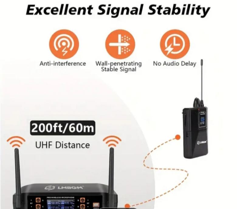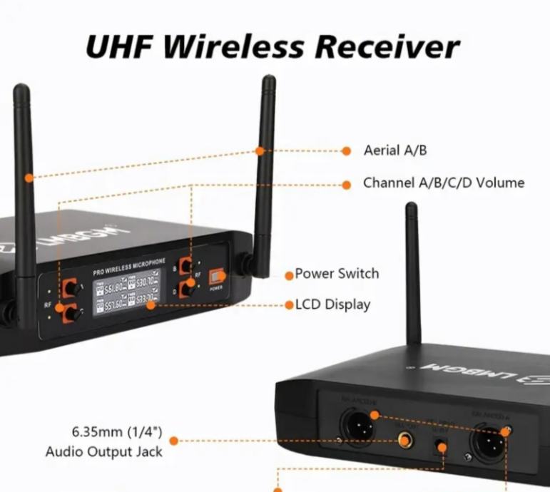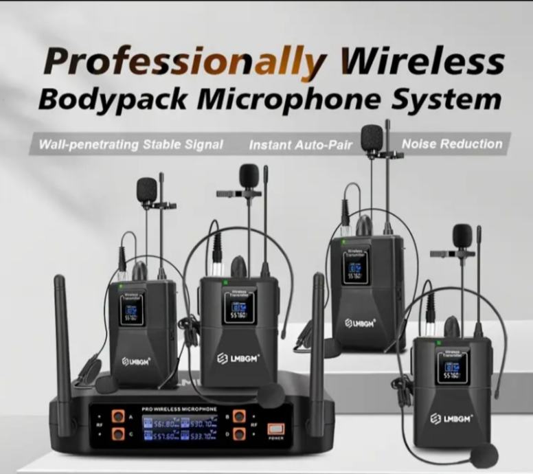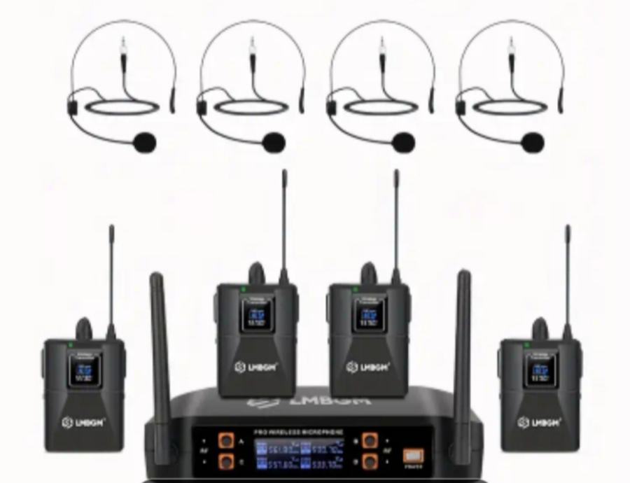 Naglavni bežični mikrofoni, set od 4 komada, za predstave ili slične događaje. Zvuk je korektan, do 40-50metara, razumljiv, mogu se podešavat zasebno svaka, i koristite broj komada po potrebi.