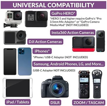 Kompatibilan je s velikim brojem uređaja — DSLR kamerama, pametnim telefonima, tabletima, laptopima i audio snimačima (GoPro zahtijeva TRRS adapter). Ovo je ultimativni plug‑and‑play audio dodatak za svakog kreatora.