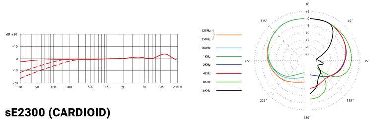 With the same look, features and specifications of the cardioid-only sE2200, the sE2300 adds a switch on its rear side to select between figure-8, cardioid, or omnidirectional polar patterns. This adds a huge degree of versatility and allows the sE2300 to shine on almost any source - from vocals to guitars to drums to pianos, or almost anything you'd like to mic.