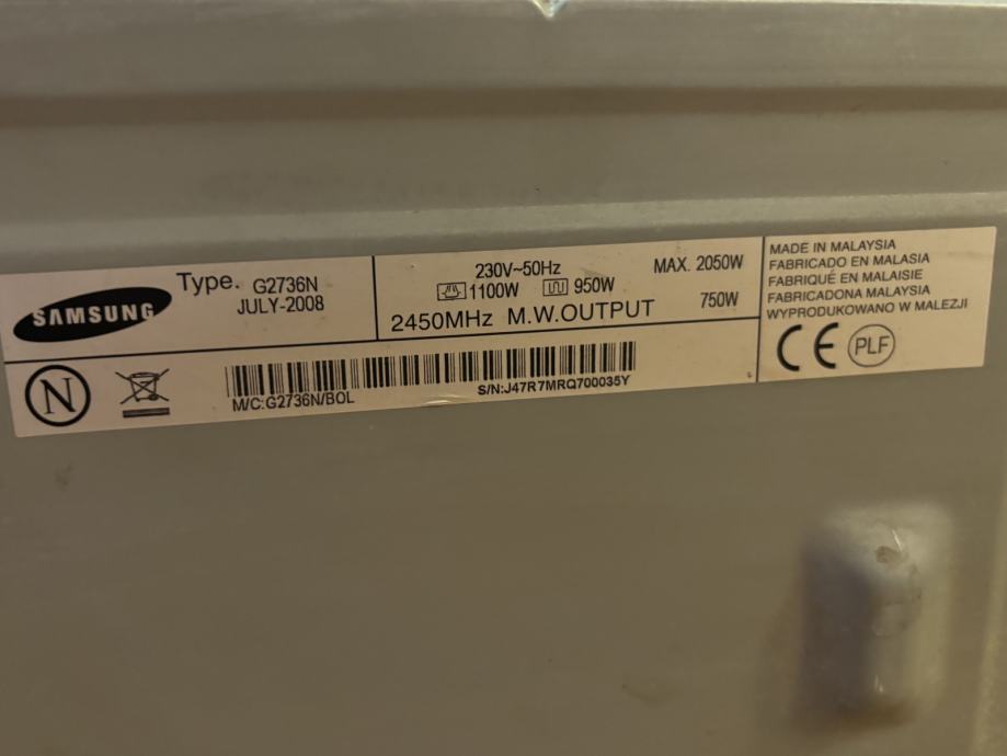 Model G2736N, 20 l, Mikrovalna:1100 W, Gril 950