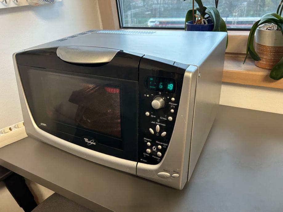 Prodajem Whirlpool mikrovalnu pećnicu u srebrno-crnoj kombinaciji. Radi se o modelu s većim brojem funkcija, uključujući grill, crisp, steam i Jet Defrost opcije, što ju čini višenamjenskom za svakodnevnu upotrebu u kuhinji. Uređaj ima digitalni zaslon i intuitivne kontrole s više gumba za odabir programa.